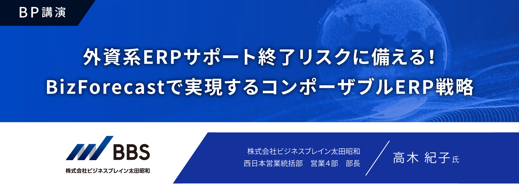 | セミナー名 | 《BizForecast Days 2025》BP講演|株式会社ビジネスブレイン太田昭和(BBS)『外資系ERPサポート終了リスクに備える!BizForecastで実現するコンポーザブルERP戦略』 |