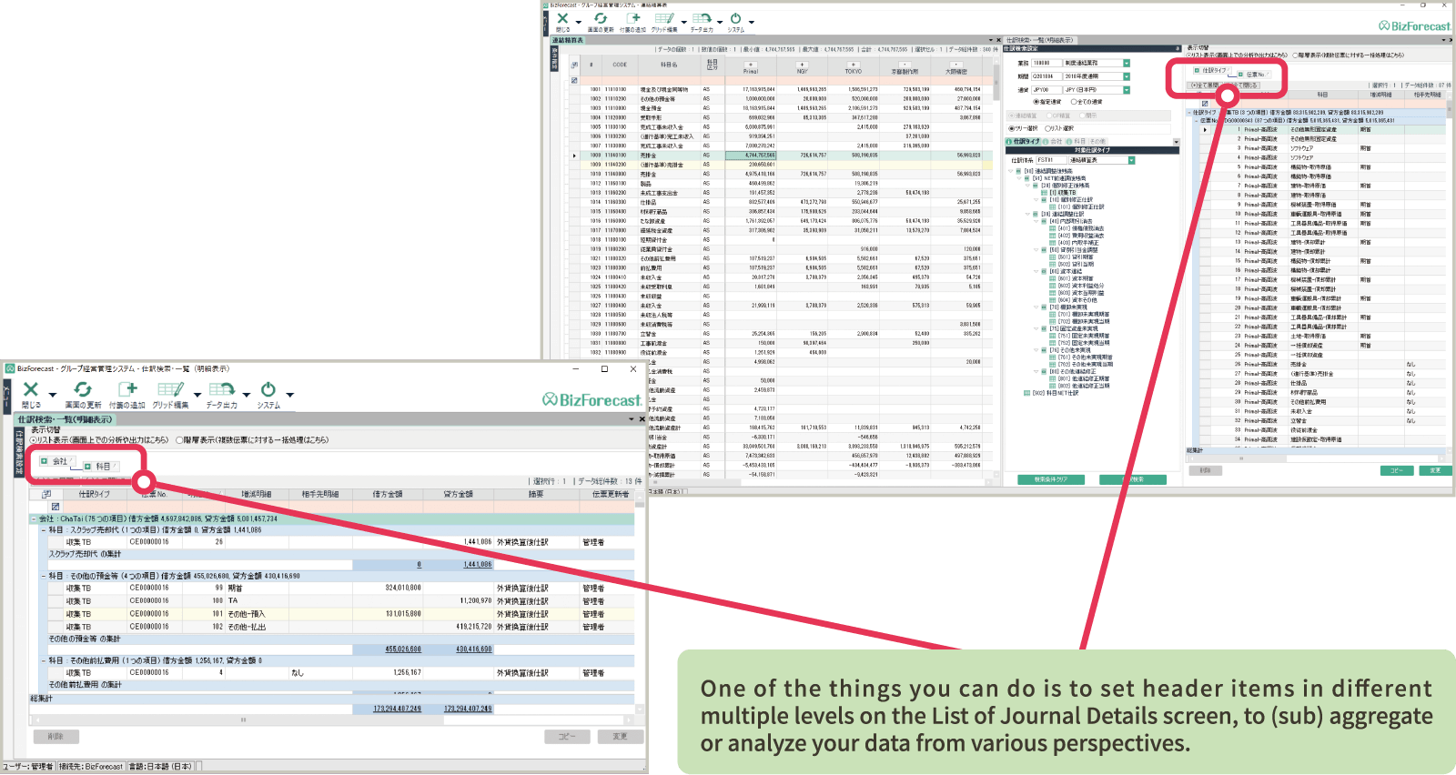 On BizForecastFC's tabular grid control, which is displayed in the Master Maintenance, Consolidated Accounting Worksheet, List of Journals, and other screens, you can filter data, display sub-aggregations, or change layouts, much like you do in MS Excel. So, you can perform all kinds of analyses and inspections on BizForecastFC without any need to export your files to Excel or other tools. Moreover, the multiple tab method lets you move more effortlessly between screens or arrange them freely horizontally or vertically so that you can easily check details and totals, or compare data before and after executing a process.
